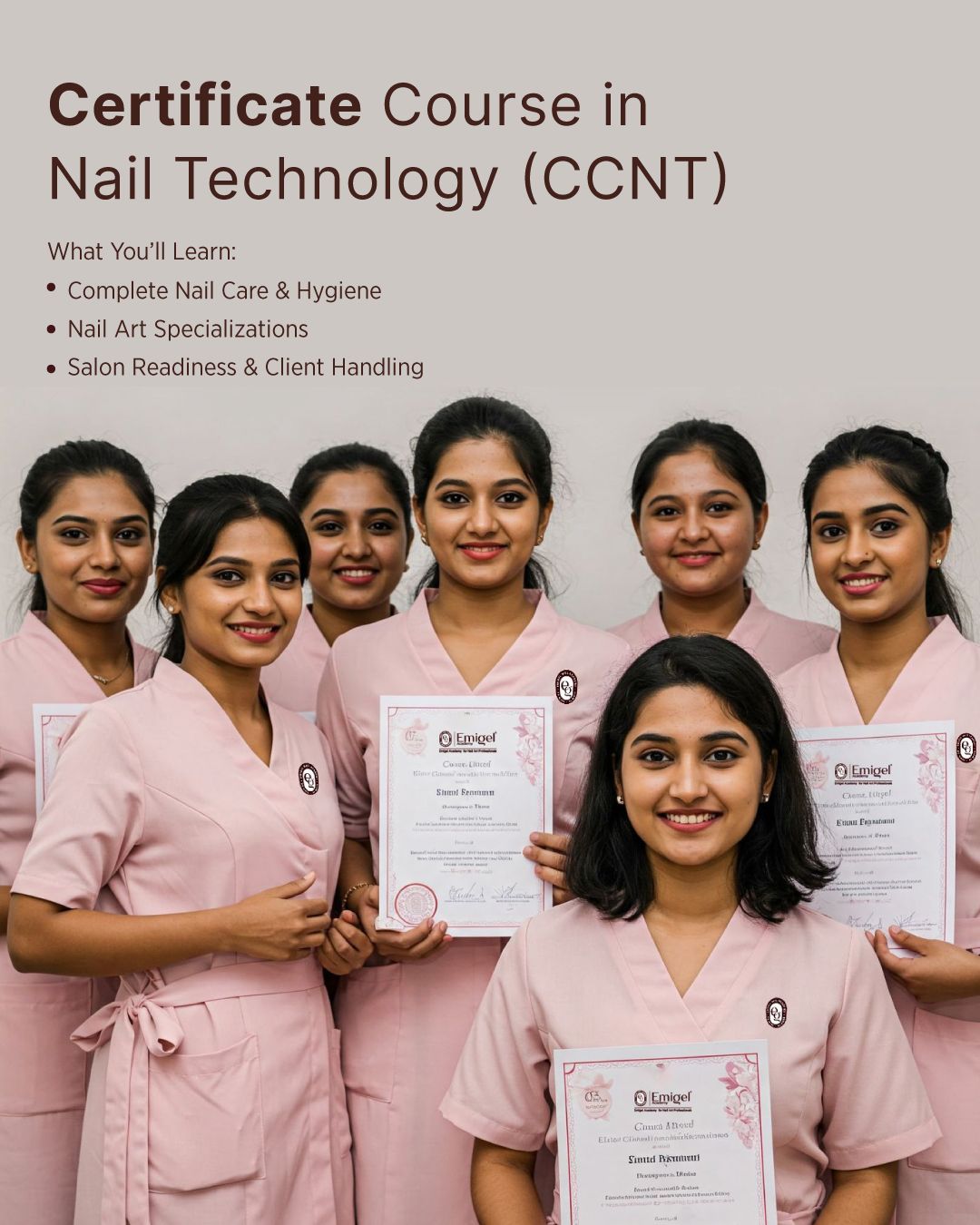 The Certificate Course in Nails is a 1 Month, 60 Hours program for beginners and professionals seeking fast-track certification. It covers nail care, hygiene, specialized nail art, and salon readiness with client handling. A professional certification is awarded upon completion.